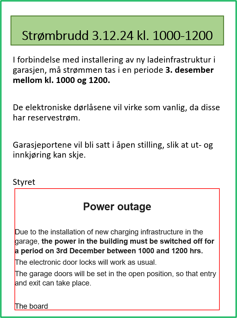 - Under oppkobling av ny ladeboks (perioden 9.-13. desember) må bilen flyttes minst en meter fra veggen mellom kl. 0700 og 1600.